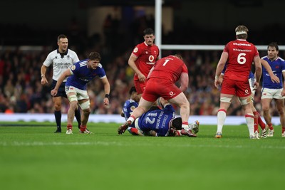 150226 - Wales v France - Guinness Six Nations Championship - Adam Beard of Wales is tackled by Dorian Aldegheri of France